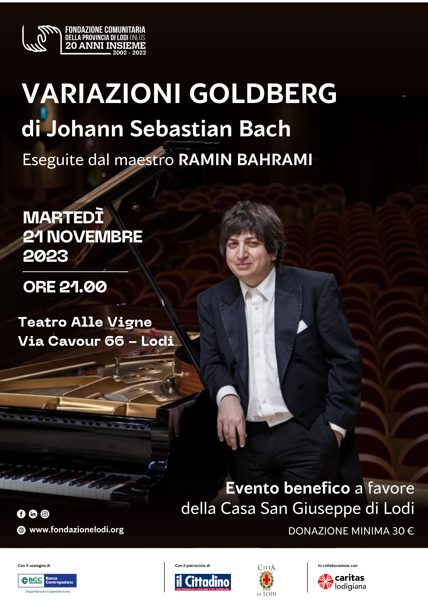 La Fondazione Comunitaria di Lodi organizza per il 21 novembre 2023 un grande evento benefico al teatro Alle Vigne, grazie al quale arriverà a Lodi il grande pianista iraniano Ramin Bahrami. Il maestro, che è tra i massimi interpreti di Bach a livello mondiale, proporrà al pubblico le Variazioni Goldberg e per una sera trasformerà la città nella capitale della musica classica e della solidarietà.